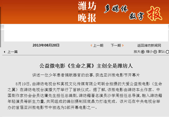 当时,这部微电影已入围亚洲百部微电影之列,并在首届亚洲微电影节上作为精选三部作品之一进行首映。”大爱公益微电影《生命之翼》投资者宋成波回顾说:“生命之翼似乎更加贴切,影片中4个受捐者一起在风筝广场扔飞机,代表了生命的翅膀。”