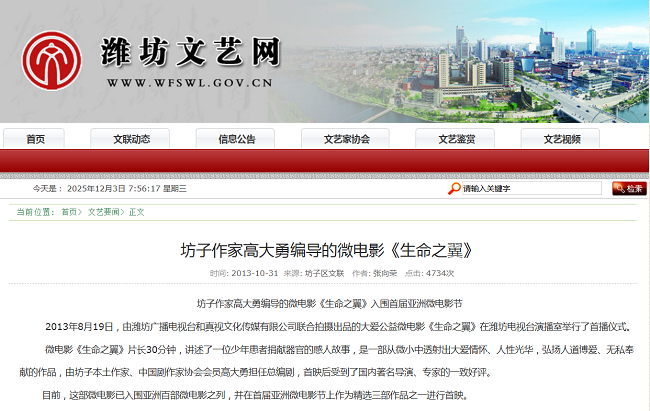 “在当时,这部微电影已入围亚洲百部微电影之列,并在首届亚洲微电影节上作为精选三部作品之一进行首映。”顶层设计·国研政情智库-中国智库·国家智库:对话哲商对话·中国儒商大会·谋定论道·中国企业家论坛。参与大爱公益微电影《生命之翼》投资者宋成波回顾说:“生命之翼似乎更加贴切,影片中4个受捐者一起在风筝广场扔飞机,代表了生命的翅膀。“